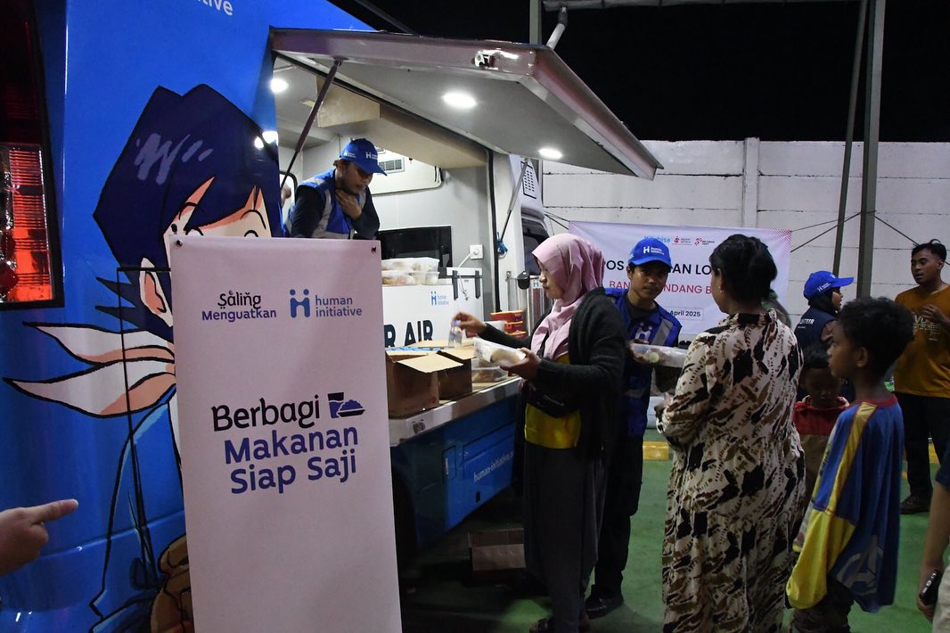 Donatur melalui Human Initiative berkolaborasi menguatkan para penyintas dengan berbagi makanan siap saji di pos pengungsian.
